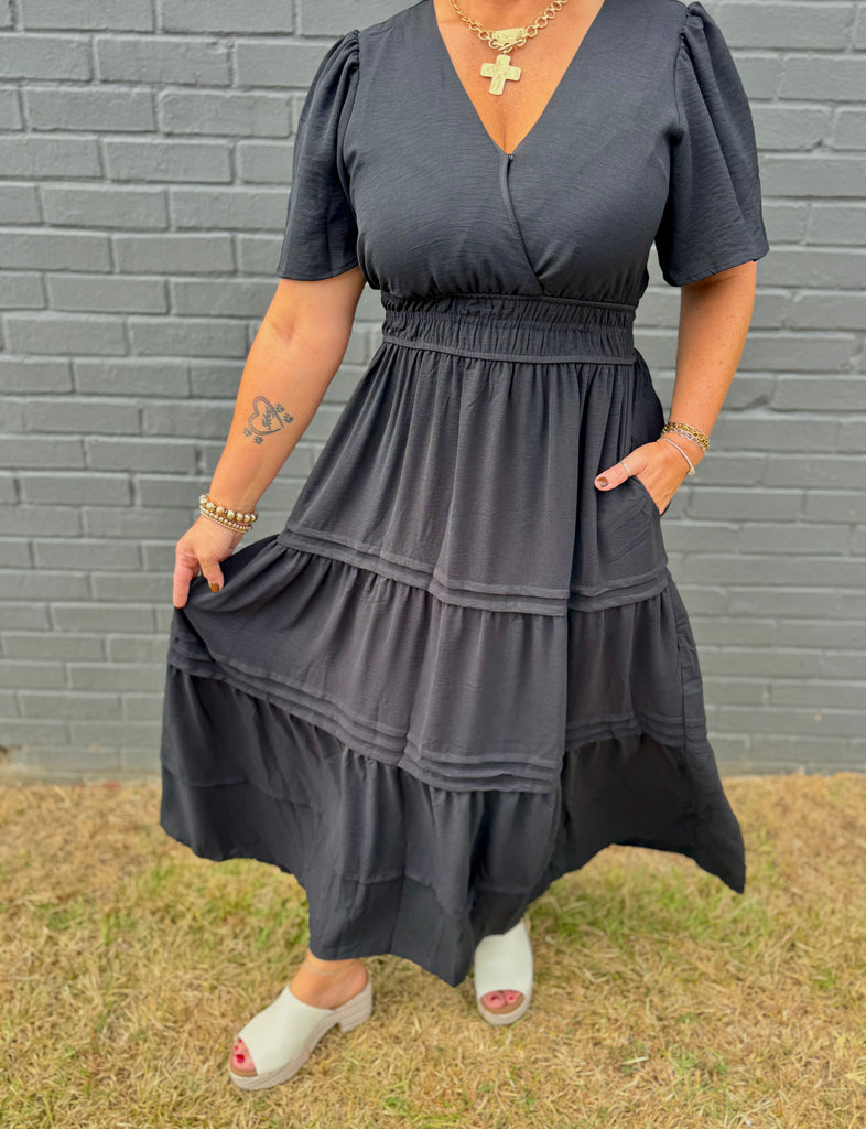 Black airflow dress with pockets. The most comfortable dress that’s perfect for so many occasions. Model is wearing a size medium. 100% polyester