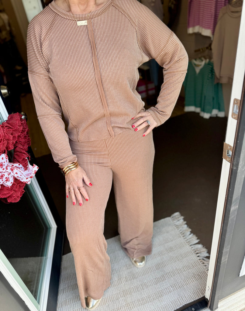 This ribbed set is a best seller because it’s incredibly comfortable and perfect to style dressy or casual! Brown ribbed stretchy soft two piece set with raw hem easy to cut. Model is wearing a size medium. 70% polyester, 23% rayon, 7% spandex.