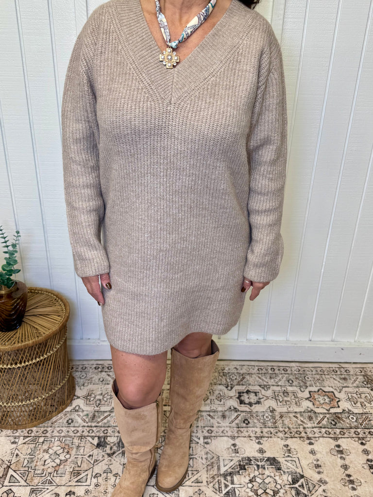 Ash mocha v-neck long sleeve sweater dress. So cozy and trendy. Model is wearing her true size medium. 47% polyester, 35% acrylic, 15% nylon, 3% spandex