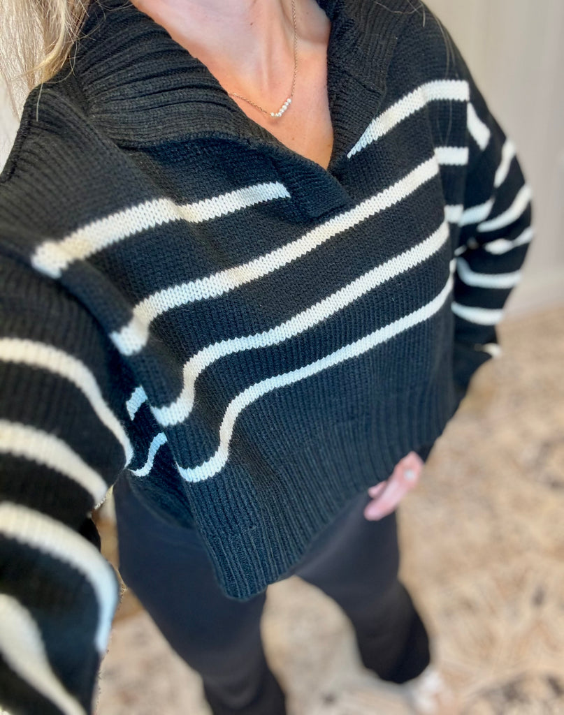Black and cream stripped cropped sweater with collar detail. True to size fit. 100% acrylic