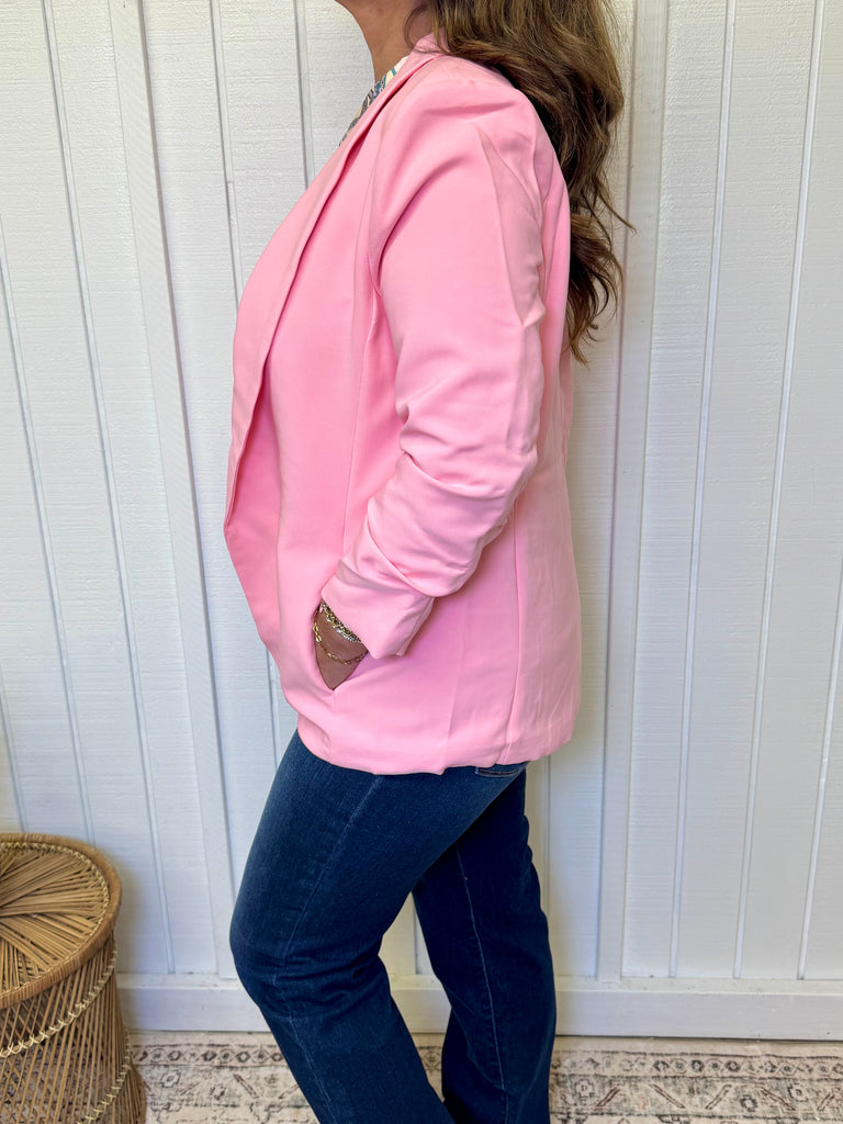 This blazer is so fun dressed up or down. Side pockets with the most fun sleeves. Comes in two colors; pink and grey. Model is wearing a size medium. Self: 96% polyester, 4% spandex. Lining: 100% polyester