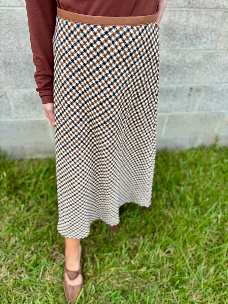 Brown/neutral checkered skirt with side zipper and leather waistline. Model is wearing a size small. 100% polyester