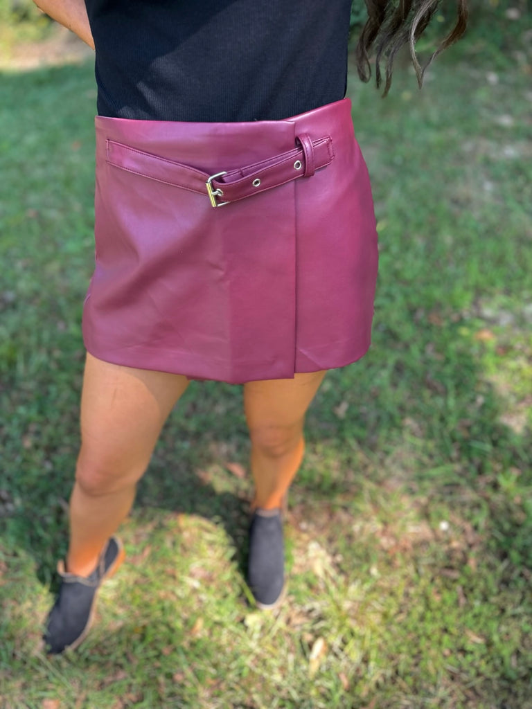 Burgundy leather skort. So comfortable and fun. True to size fit. 100% polyester
