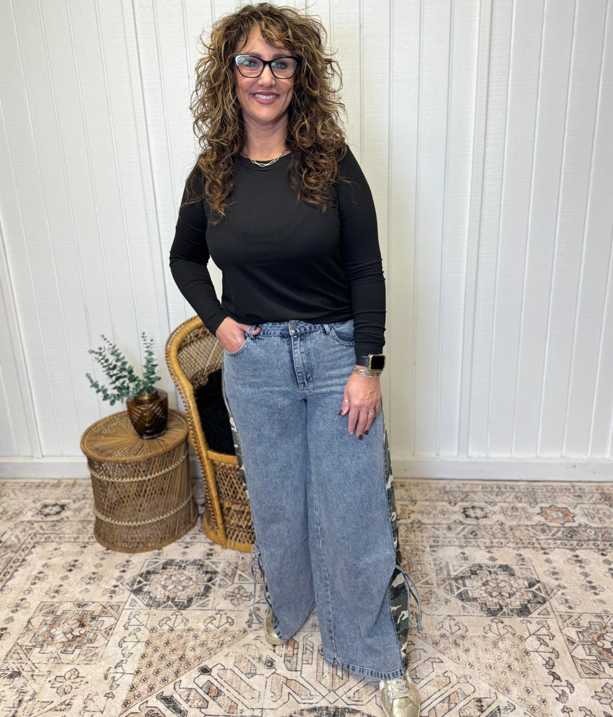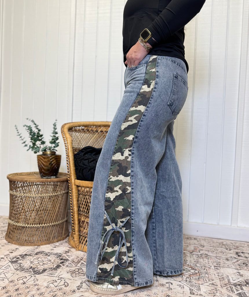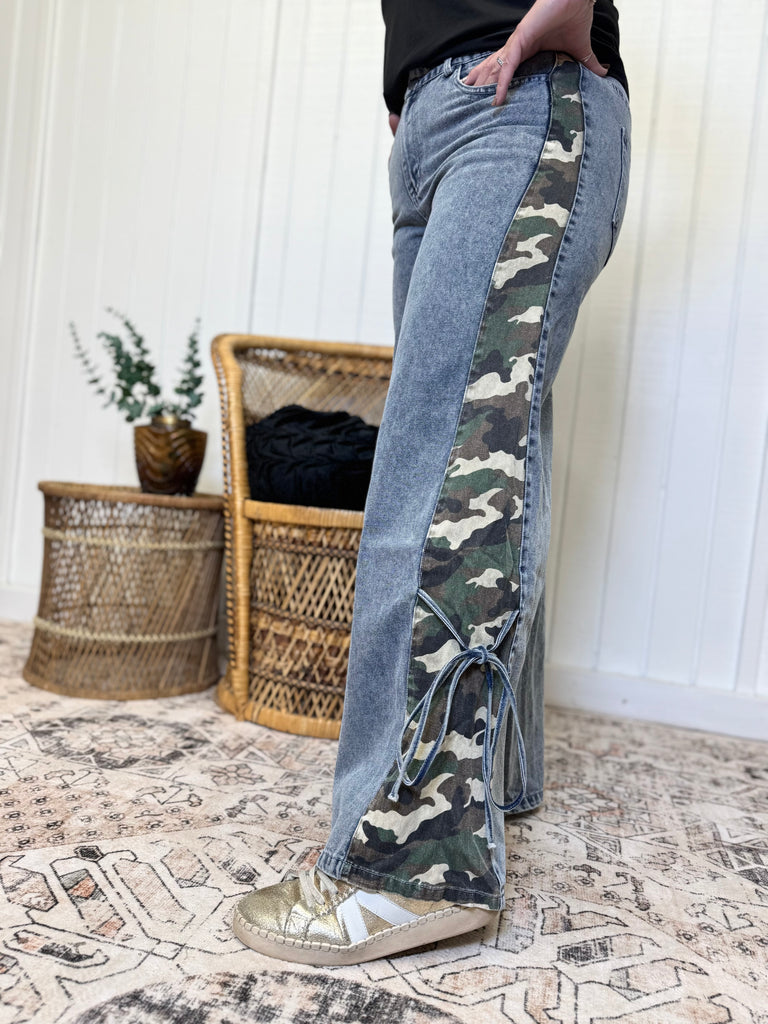 Light washed denim jeans with side camo and bow tie detail. So comfortable and right on trend. Model is wearing a size medium. 90% cotton, 10% polyester