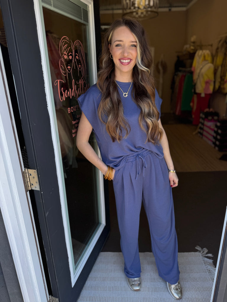 Lightweight buttery soft two piece matching set. Fold under sleeves with functional pockets and drawstring on pants. So effortless and perfect to dress up or down. Model is wearing a size small. Comes in two color options; blue & grey. 70% rayon, 30% polyester