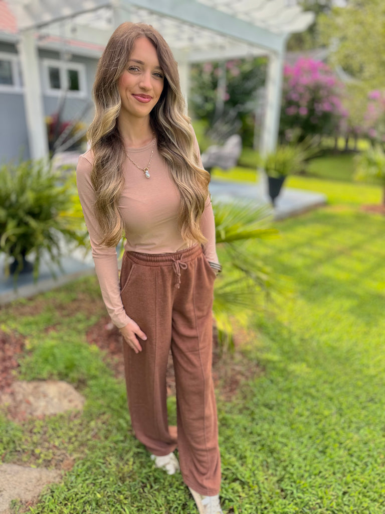 Chestnut sweatpants with pockets and adjustable waistband. Model is wearing a size small. 51% cotton, 49% polyester