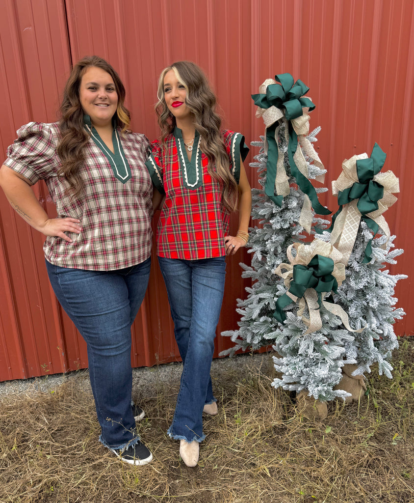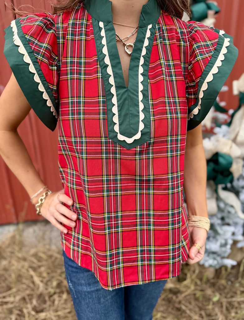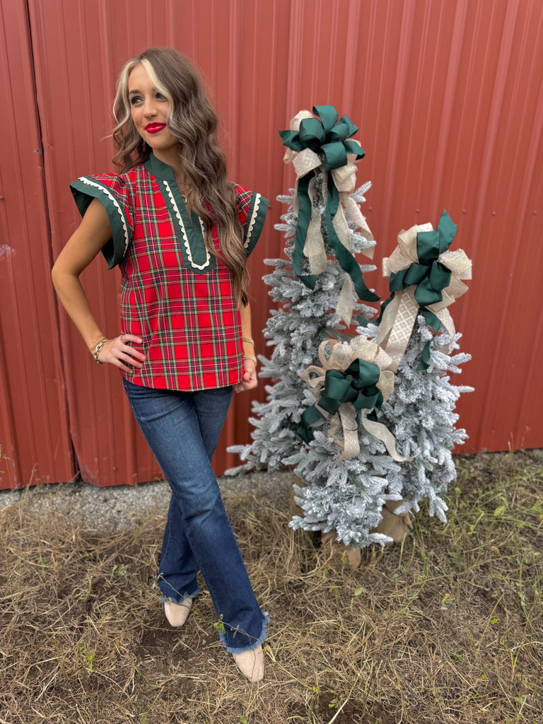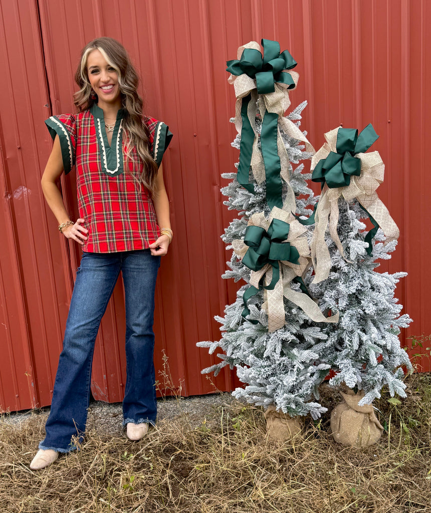 Red plaid ruffle top. Model is wearing her true size small. 65% polyester, 35% cotton