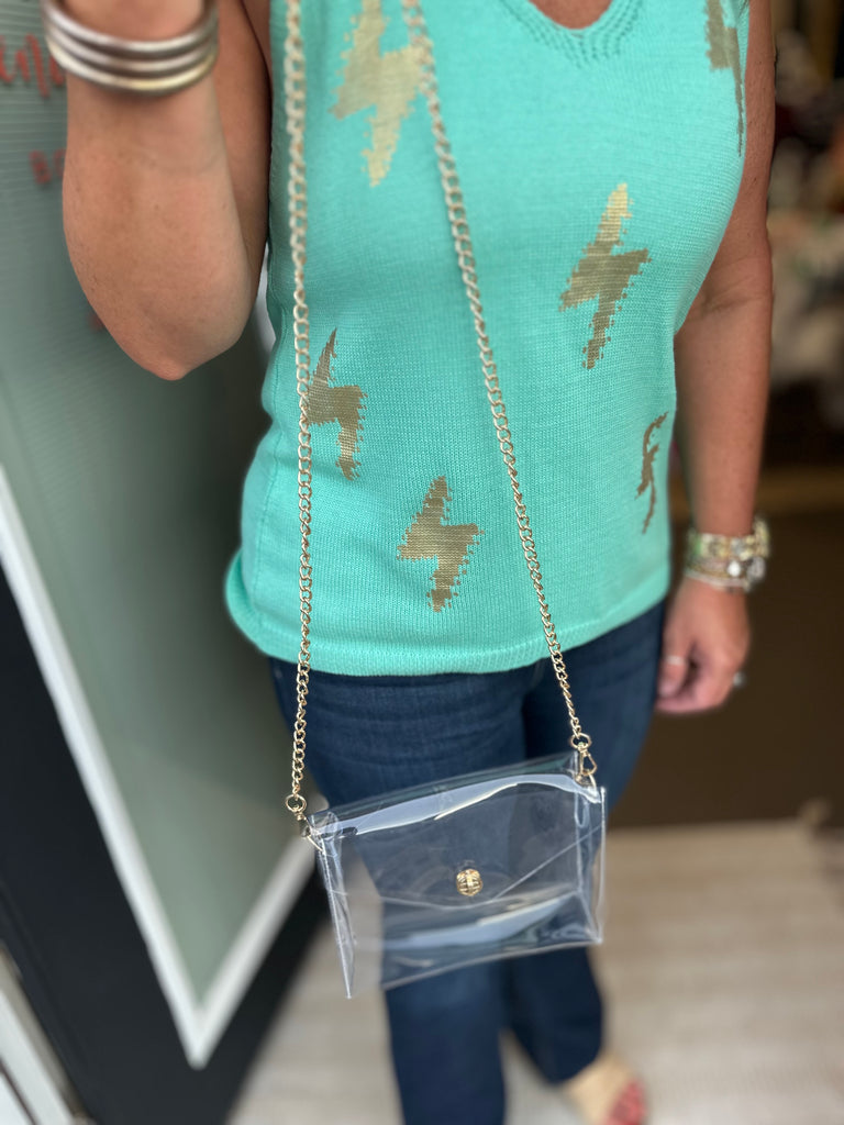 Clear crossbody purse with gold chain. Lightweight and perfect to hold all your essentials.