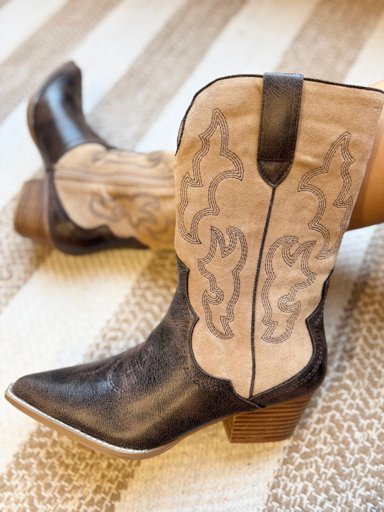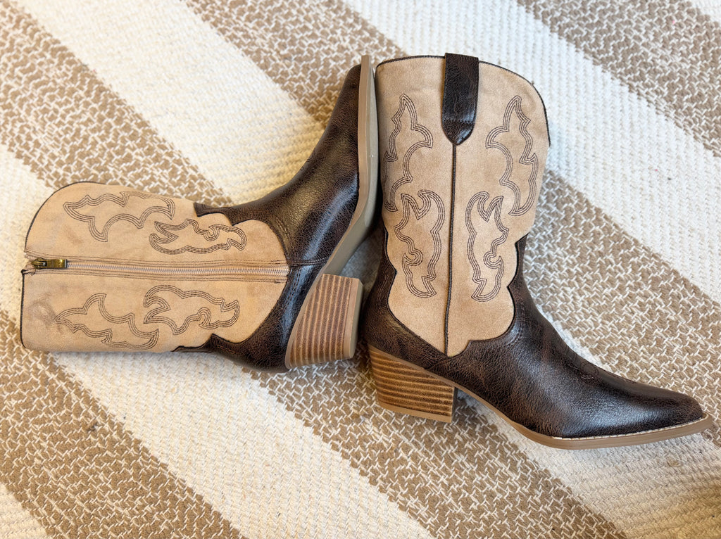 Corkys Footwear. Espresso sand cowgirl boots with side zipper. True to size fit, if half size we recommend sizing up.