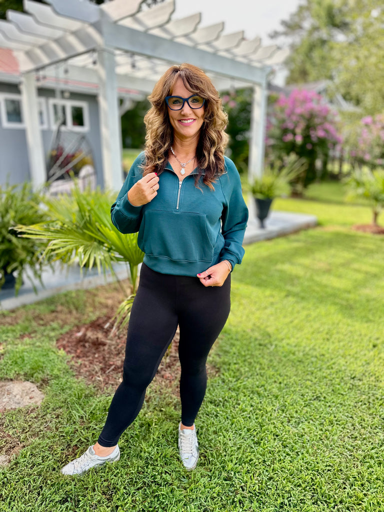 Deep green scuba pullover with quarter zip. True to size fit. 46% rayon, 47% polyester, 7% spandex