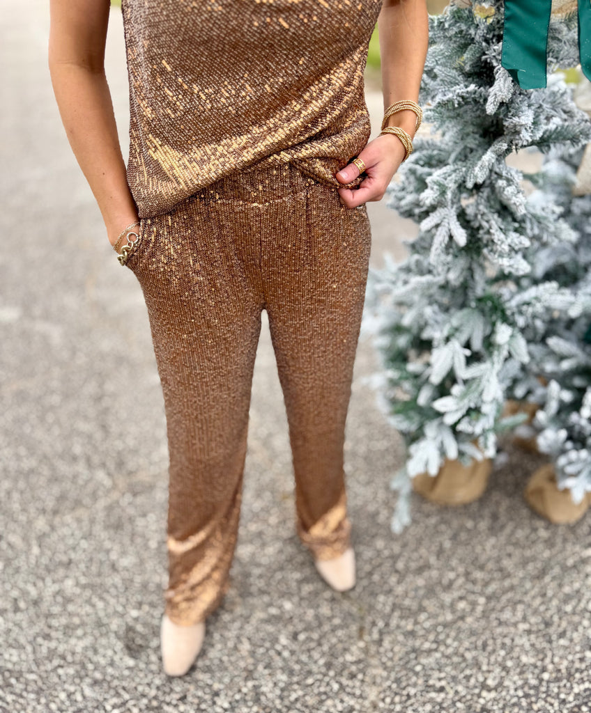 Bronze sequin pull on stretchy pants with pockets and wide waist band. Model is wearing a size small. 95% polyester, 5% spandex