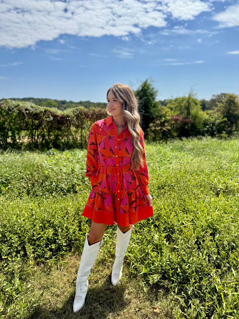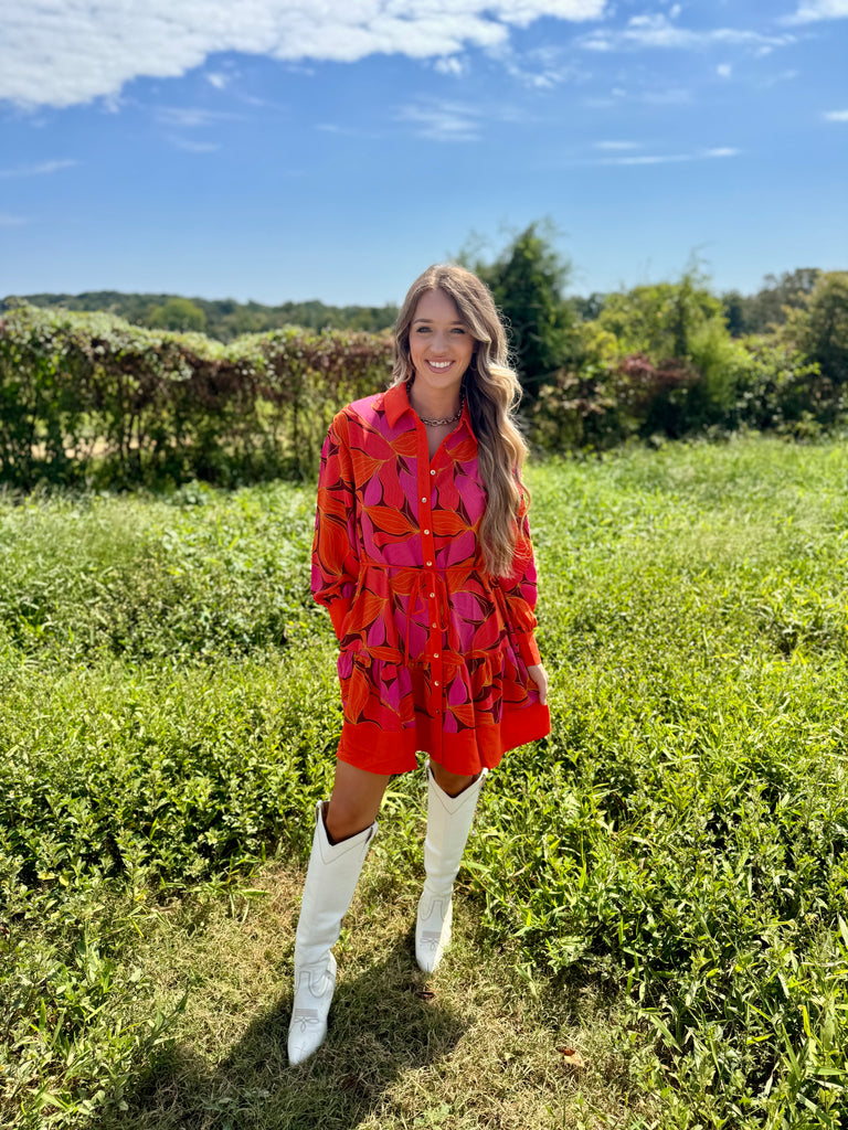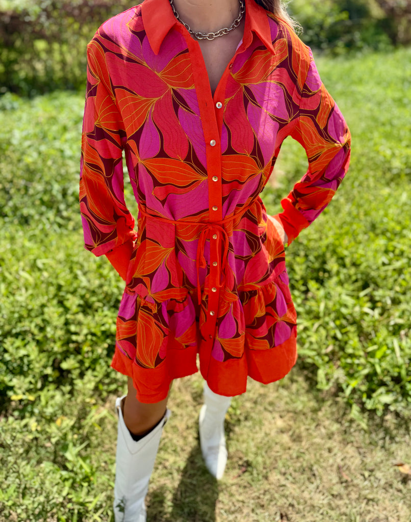 Hot pink and orange button down long sleeve dress with pockets and adjustable tie belt. Model is wearing a size small but very roomy. 100% polyester