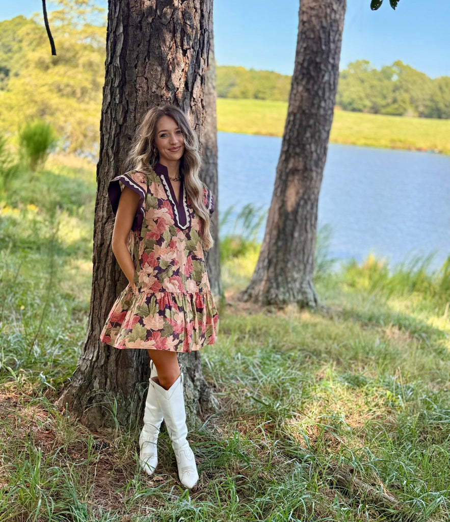 Ruffle sleeve dress with fall leaves details. Pockets and lined. Model is wearing a size small. 100% cotton