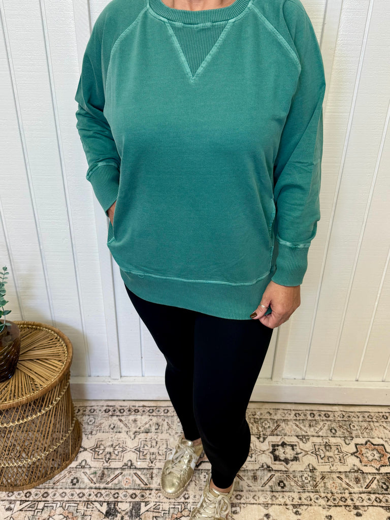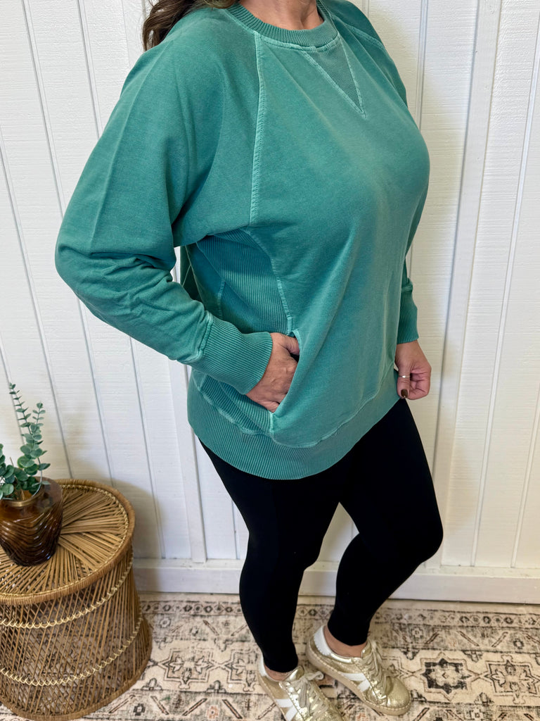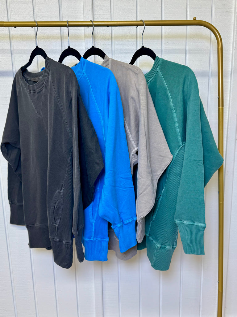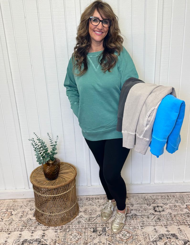 These best selling crewneck with pockets are amazing. So lightweight, comfortable, and trendy! Model is wearing a size medium. Comes in four beautiful color options; sage, charcoal, blue, and beige. 100% cotton.