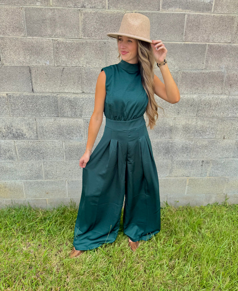 Silk halter neck jumpsuit. True to size fit. 100% polyester. Comes in two color options: black and dark green.