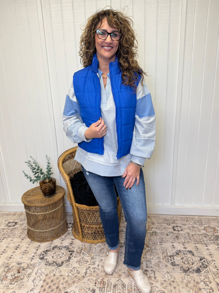 Royal blue lightweight puffer vest with collar and pockets. So trendy and fun. Model is wearing a size medium. 100% polyester