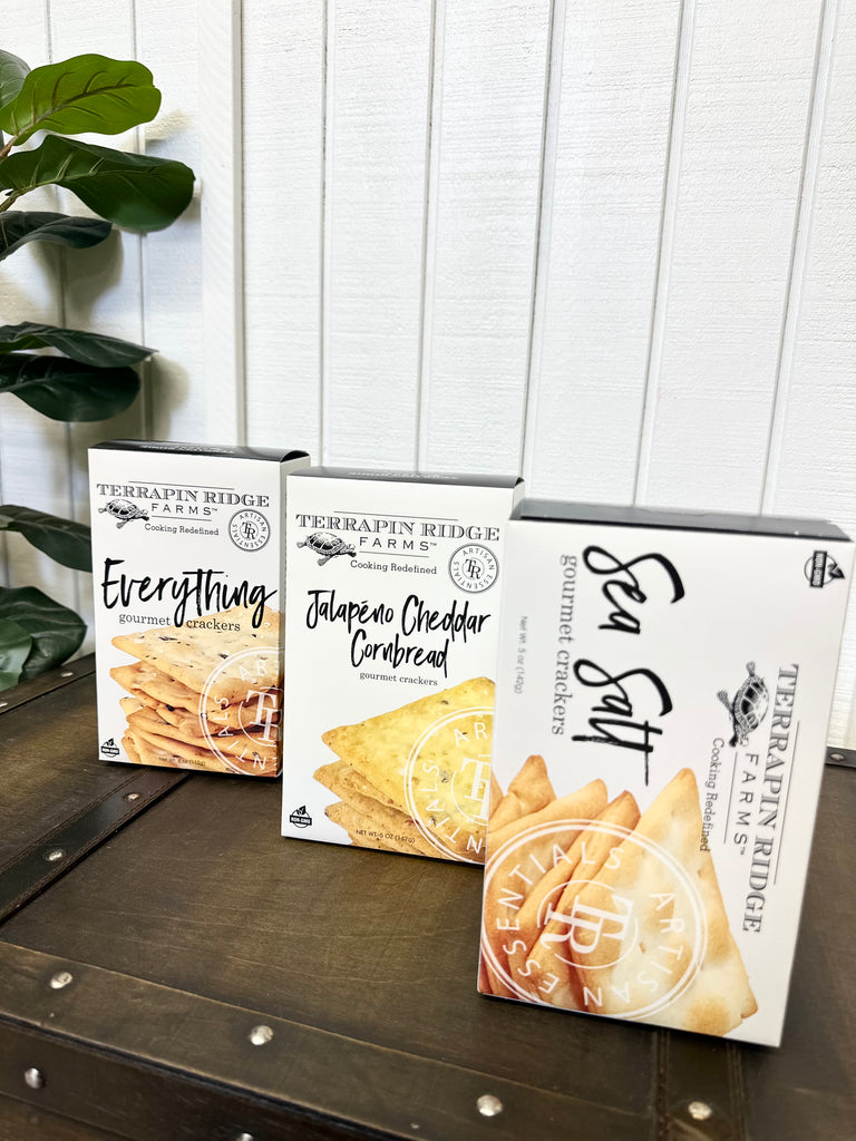 Terrapin Ridge Farms Gourmet Crackers. These crackers pair well with our dips. Three flavors: Everything bagel, jalapeño cheddar cornbread, sea salt.