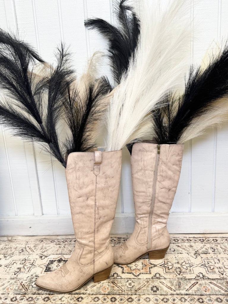 Corkys Footwear. Tall knee high light pink putty crackle boots. The perfect western style with pointed toe design. A very comfortable 2” heel and functional side zipper. If half size, we recommend sizing up. Can fit up to a 14” calf.