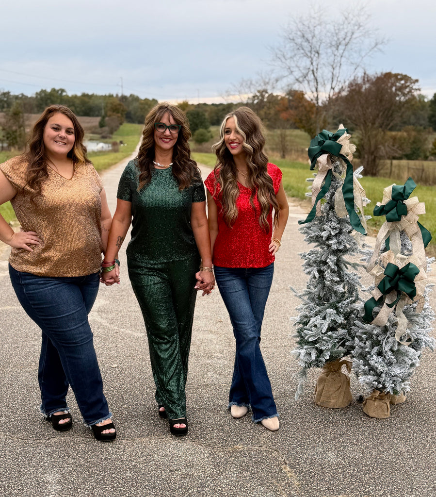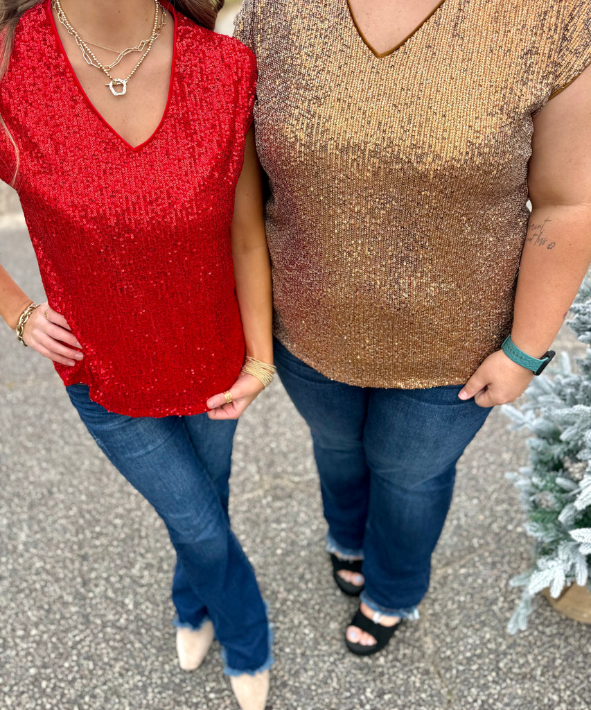 Bronze v-neck sequin top. True to size fit. Model is wearing a size 3x. 95% polyester, 5% spandex