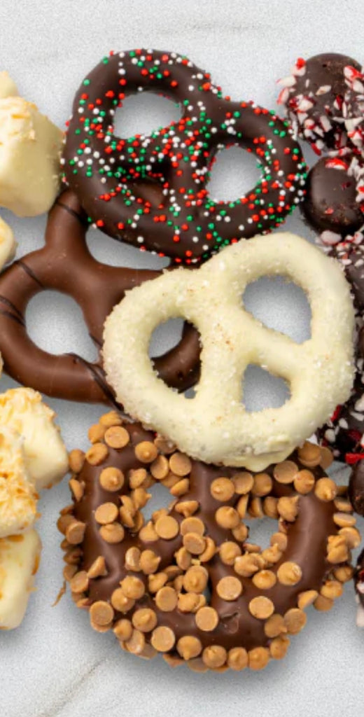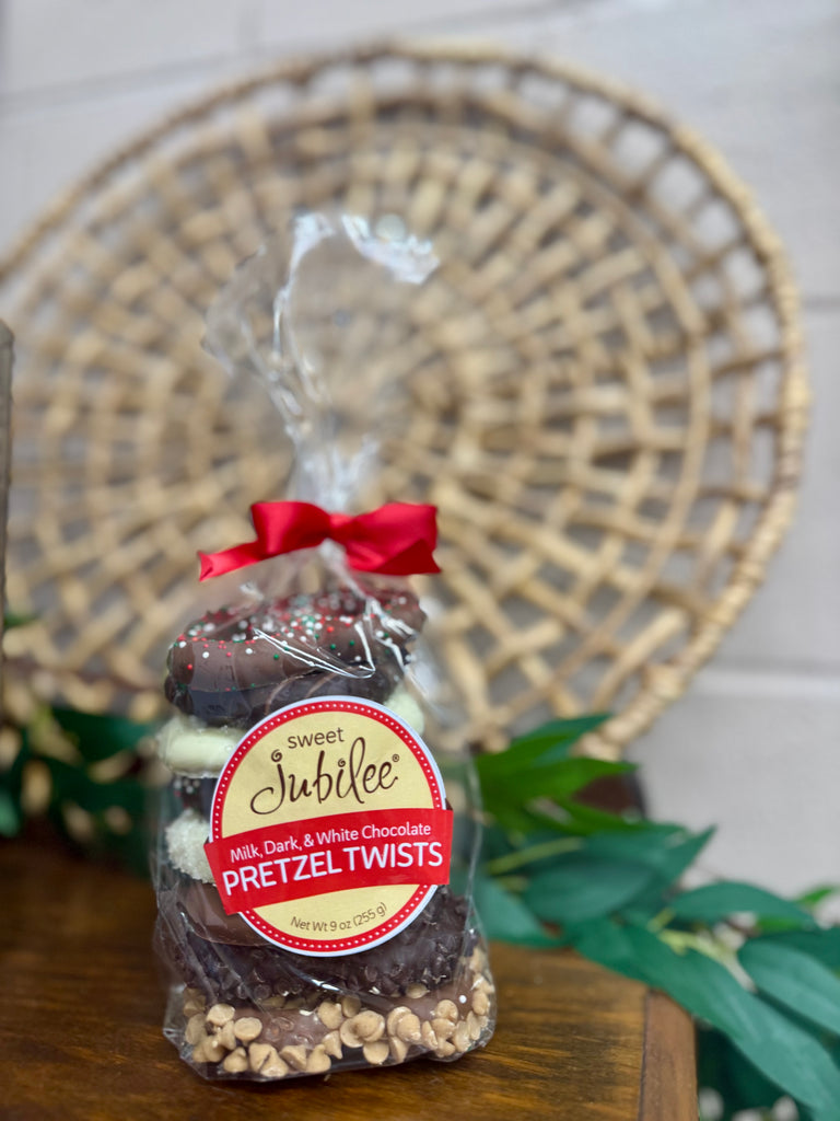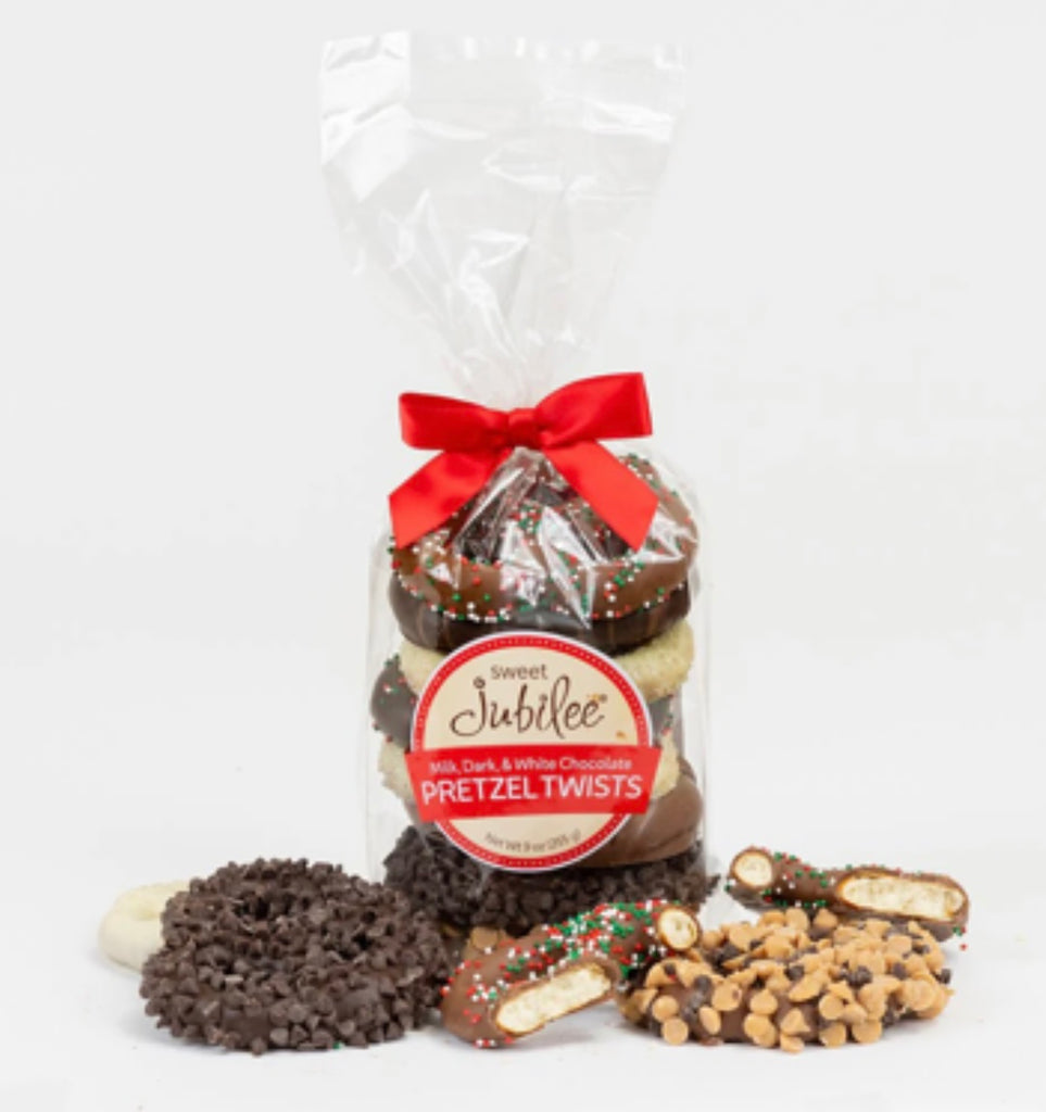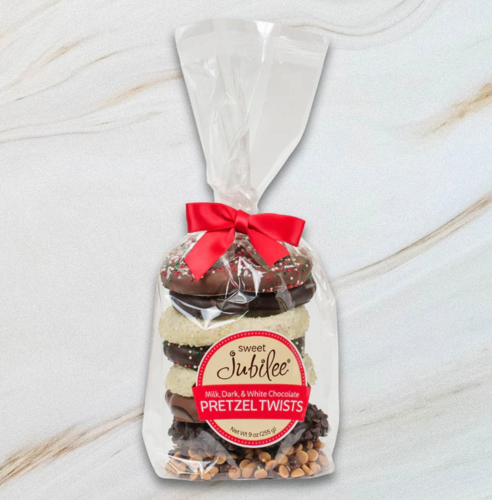 9oz bag of milk, dark, and white chocolate pretzel twist with assorted toppings. So delicious and fun gift idea!