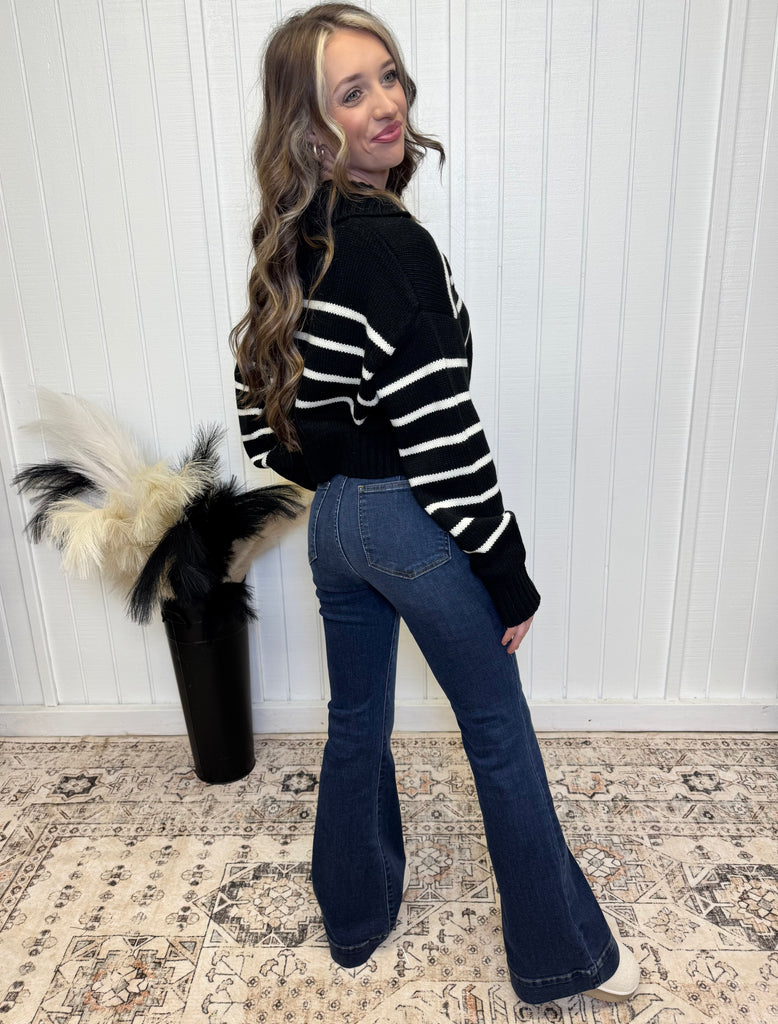 Judy Blue dark denim high waisted trouser flares. Extremely soft and stretchy. Model is wearing a size 1(25). 93% cotton, 6% polyester, 1% spandex