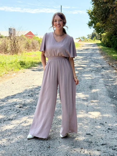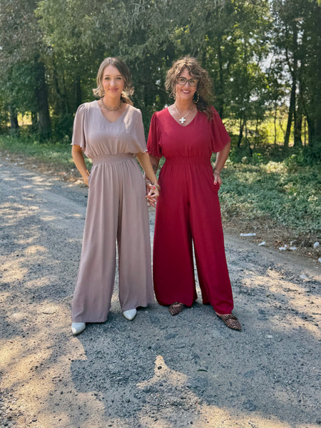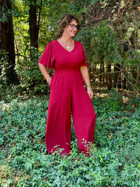 Flowy jumpsuit that comes in two color options with pockets. Can size down, smocked waistline which makes very slenderizing. 100% polyester