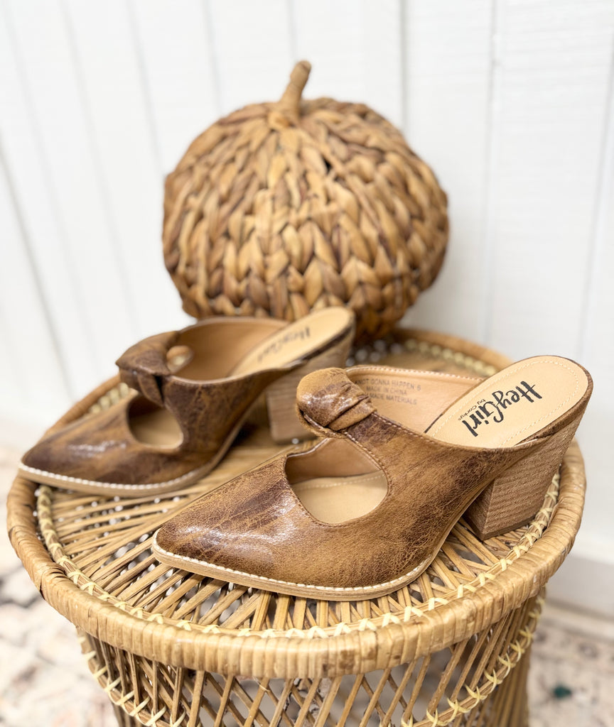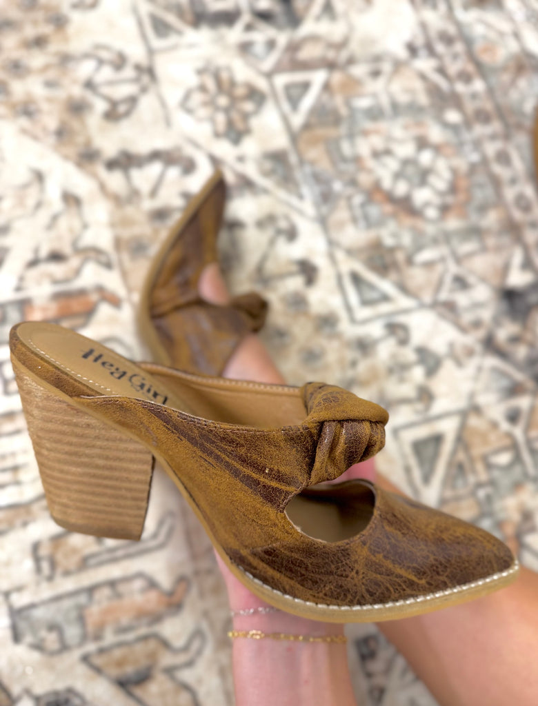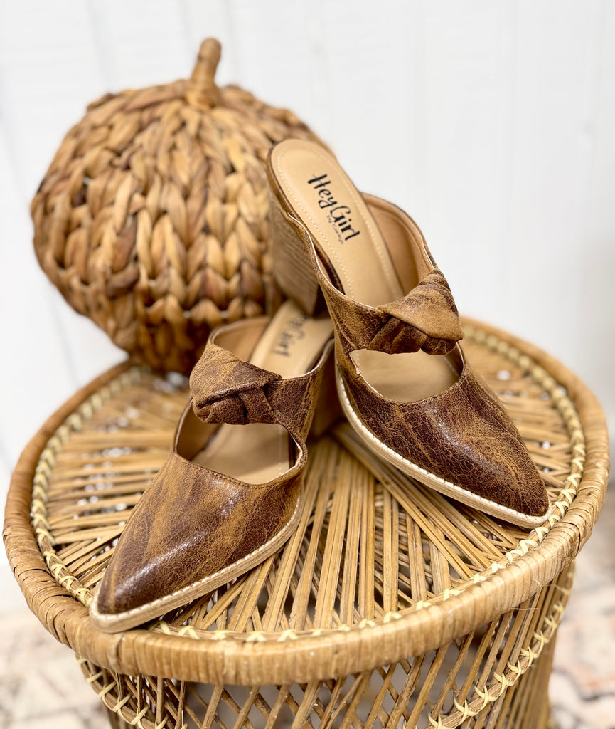 Corkys Footwear. Cognac pointed toe heels. Distressed faux leather with the cutest knotted bow accent. Approximate 3” heel. True to size fit, if half size we recommend sizing up to the next whole size.