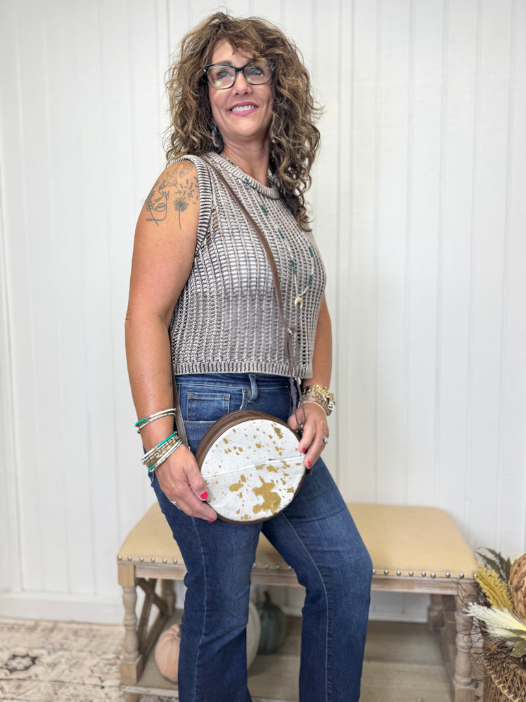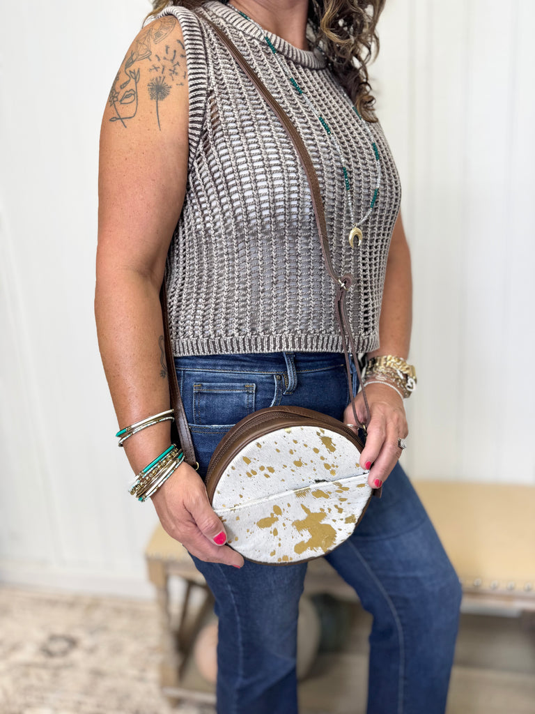 Brown leather crossbody with white cowhide detail. So trendy! 8” L x 2” W x 8” H
