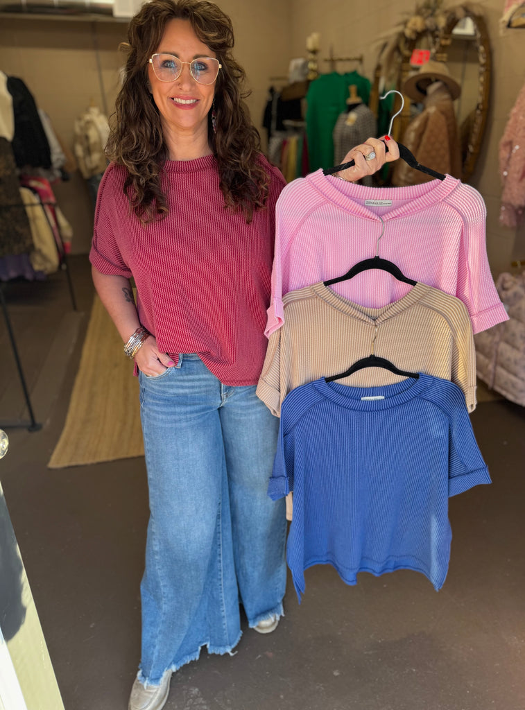 Solid ribbed short sleeve top. This top is a best seller because it’s easy and comfortable. It’s always good to have a basic top that’s your go-to. Model is wearing a size s/m. 78% polyester, 19% rayon, 3% spandex