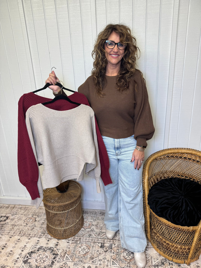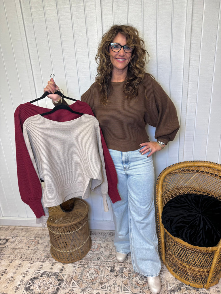Ribbed boat neck ballon sleeve sweater top. Model is wearing her true size medium. Comes in three color options; burgundy, tan, and brown. 50% viscose, 28% nylon, 22% polyester