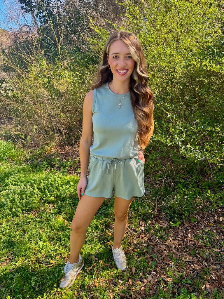 Buttery soft sage two piece matching set. Tank top with stretchy band detail with matching drawstring shorts with pockets. Model is wearing her true size small. 46% rayon, 47% polyester, 7% spandex