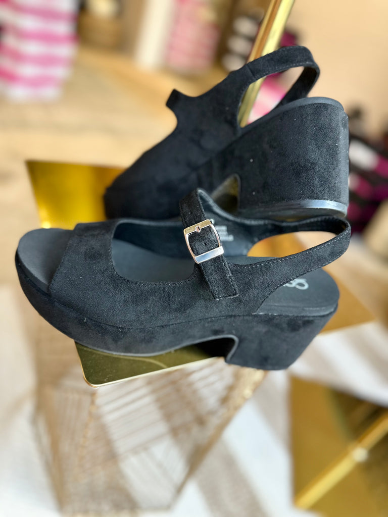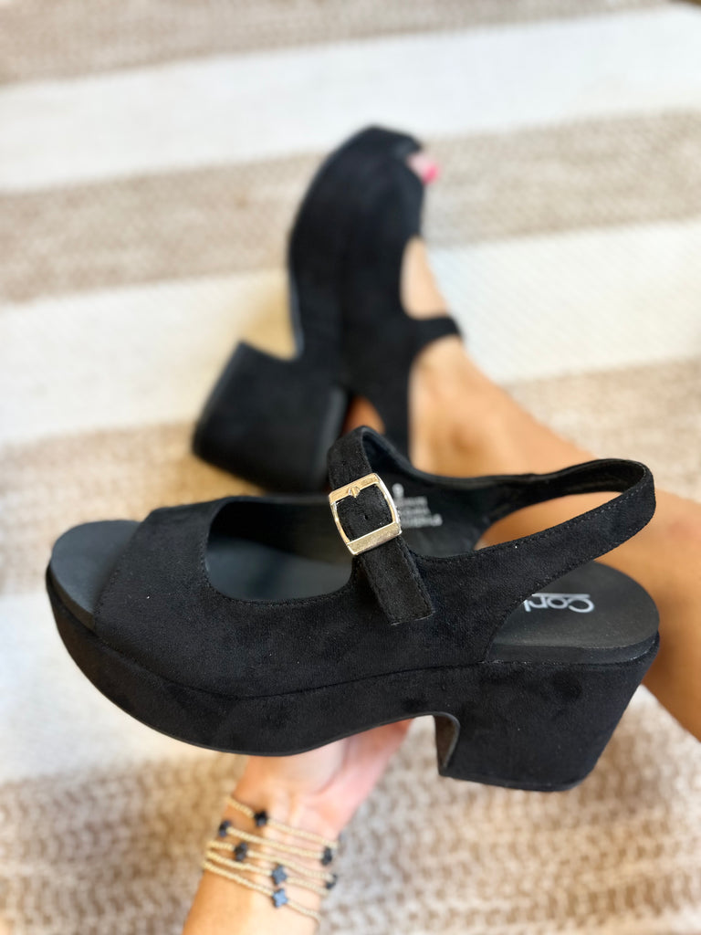 Corkys Footwear. Black faux suede with silver buckle detail. Approximately 3” heel. True to size fit, if half size we recommend sizing up.