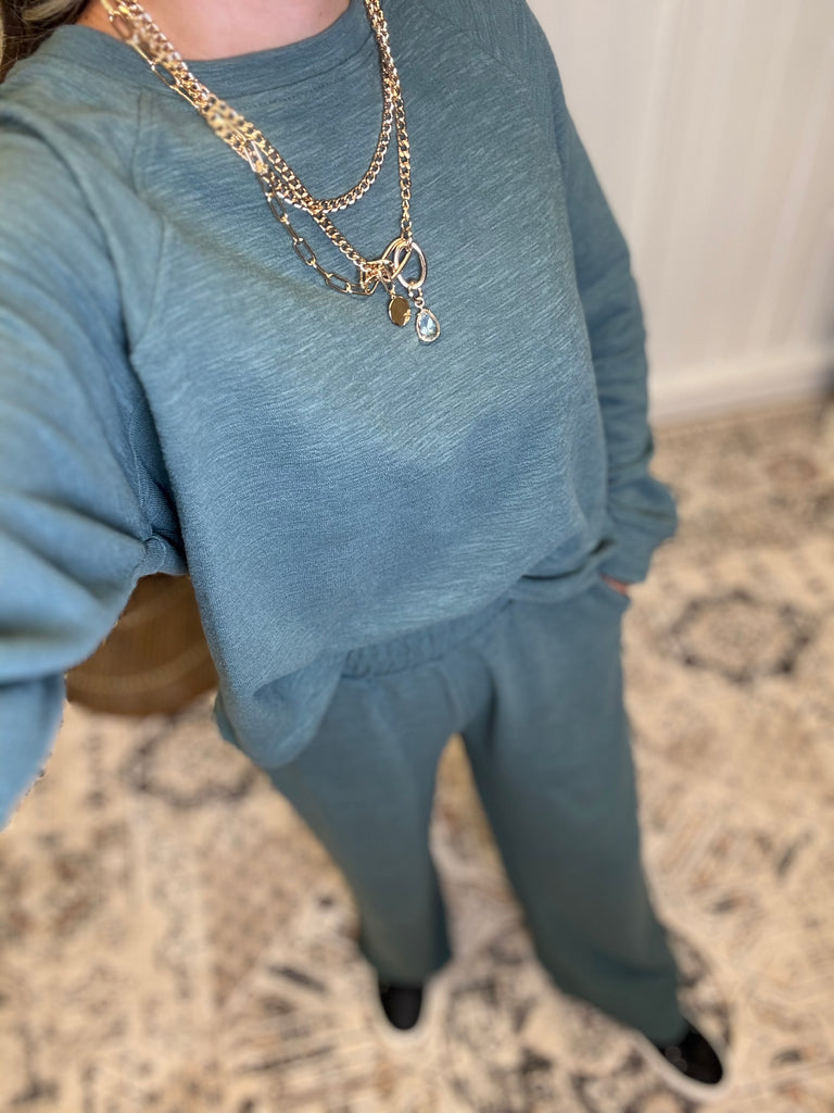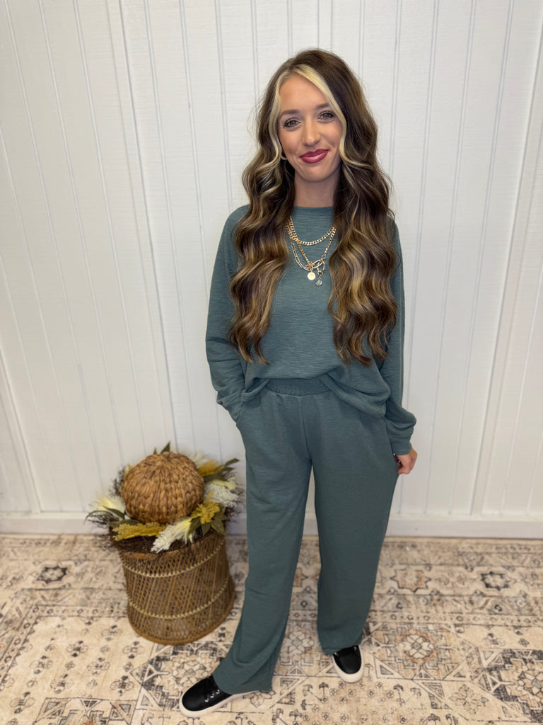 Jade two piece matching set. Very stretchy and oversized. Pants have pockets and stretchy waistband. 59% cotton, 39% polyester, 2% spandex
