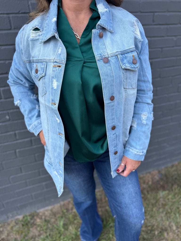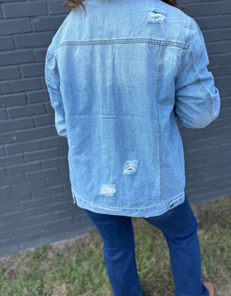 Risen Jeans brand. Very oversized distressed denim jacket. Model is wearing a size small. 100% cotton