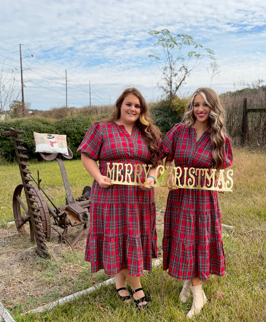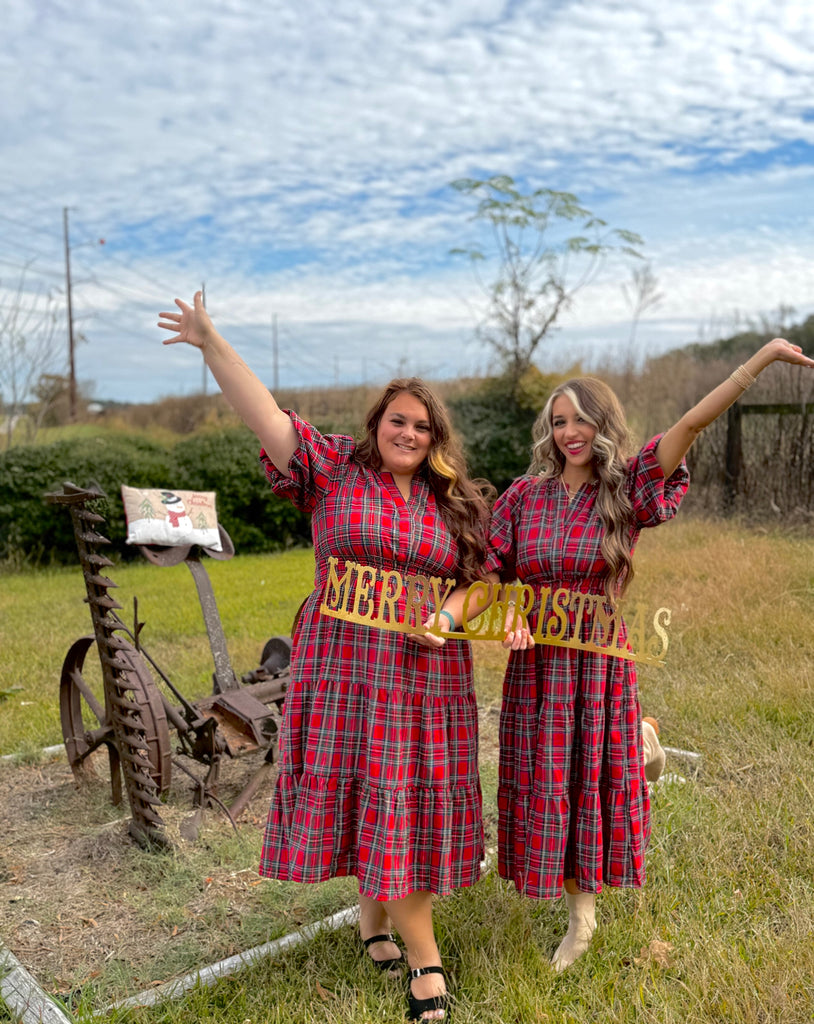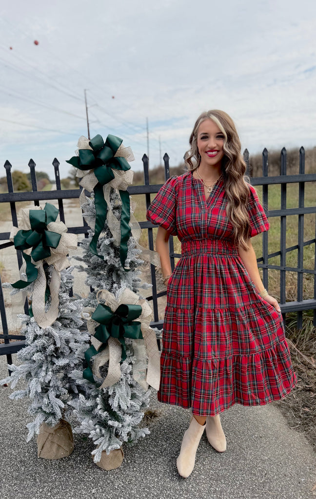 Red plaid dress with smocked waistline and pockets. True to size fit. Self: 65% polyester, 35% cotton. Lining: 100% polyester