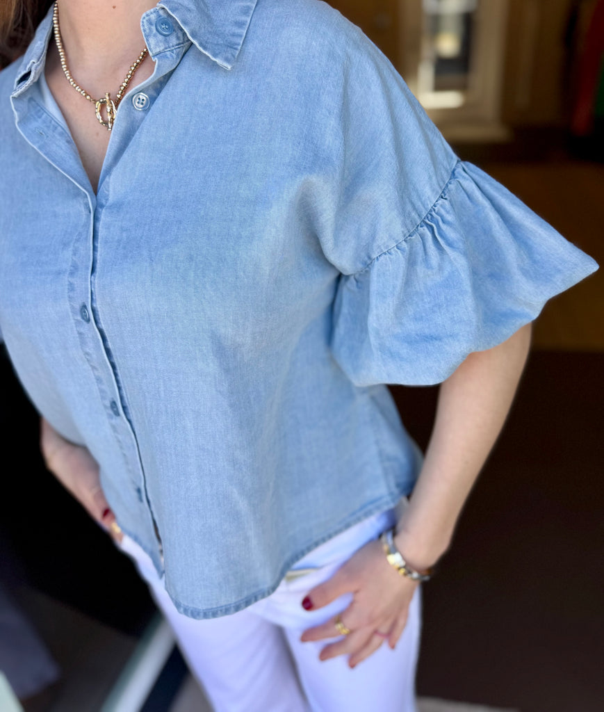 Stretchy puff sleeve button down front top in the color denim. So cute and perfect to wear open or closed. Model is wearing a size small. 100% polyester