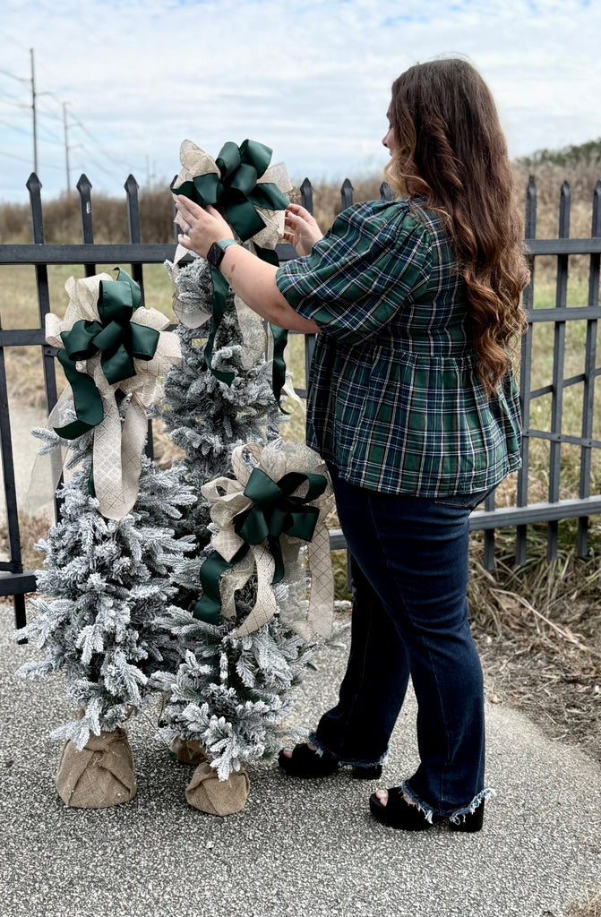 Hunter green plaid top with front bow detail. True to size fit. Self: 65% polyester, 35% cotton. Lining: 100% polyester