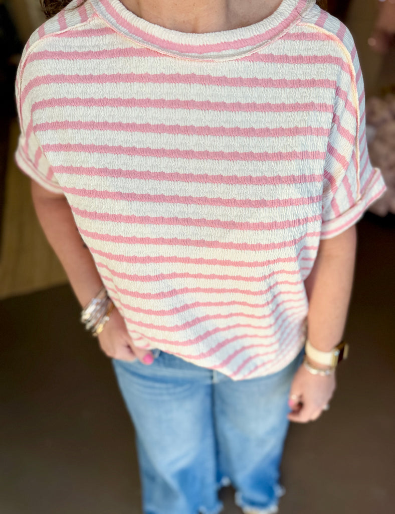 Short sleeve stripped top in the prettiest pink color. Model is wearing a size s/m. 50% cotton, 43% polyester, 7% spandex