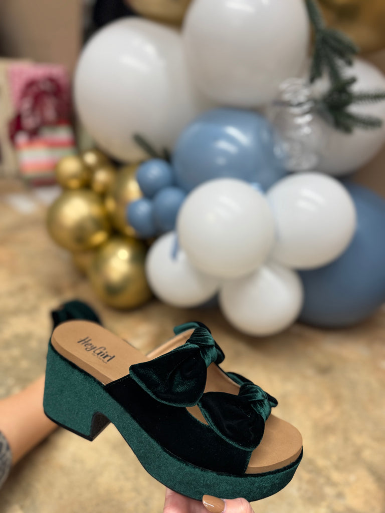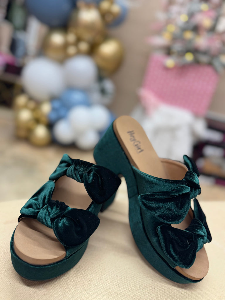 Evergreen velvet Corkys Footwear. Double bow detail to keep it right on trend and sassy. Chunky block heel and easy slip on design. Memory foam padding for all day comfort. True to size fit, if half size we recommend sizing up.