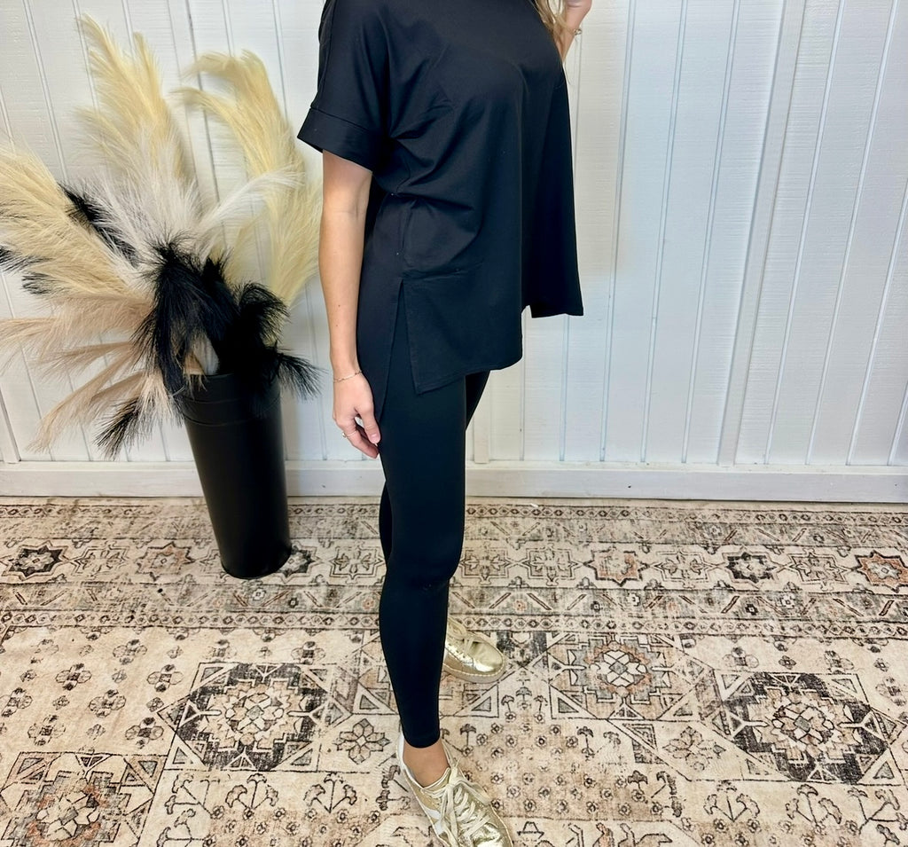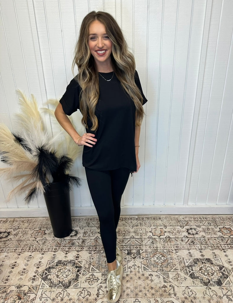 Black buttery soft matching set. Oversized black top with buttery soft black leggings to match. Perfect for all occasions while being comfortable. Model is wearing her true size small. 90% polyester, 10% spandex