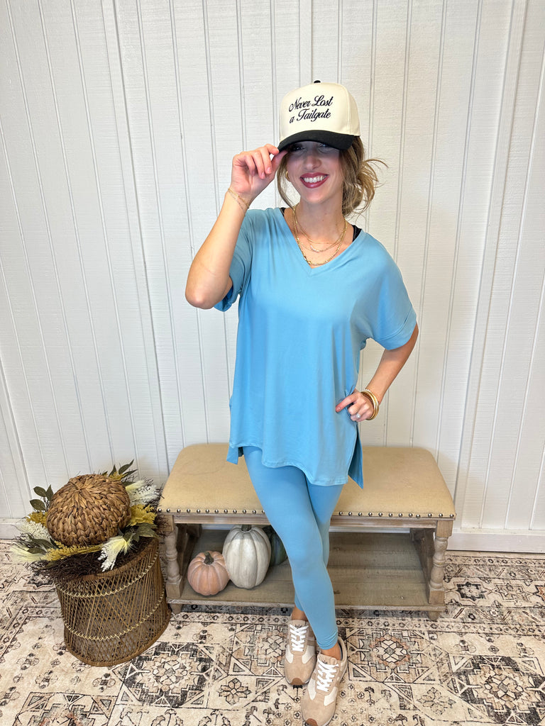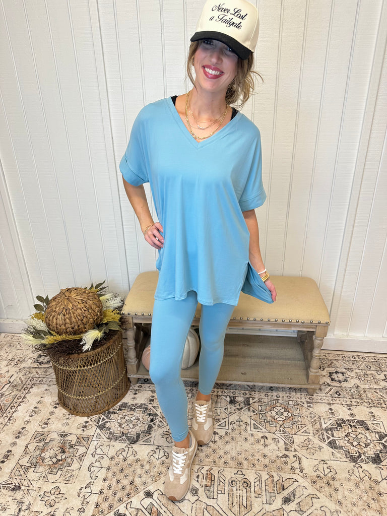 Baby blue buttery soft matching oversized v-neck top and leggings set. Perfect for all occasions while being comfortable. 90% polyester, 10% spandex