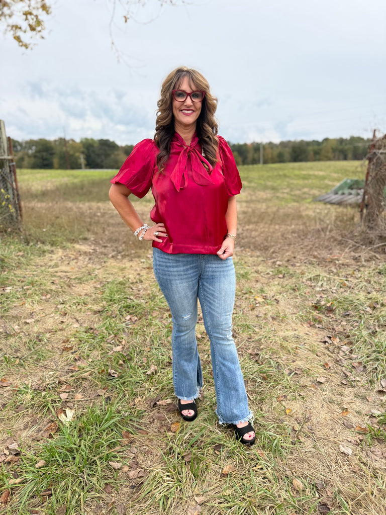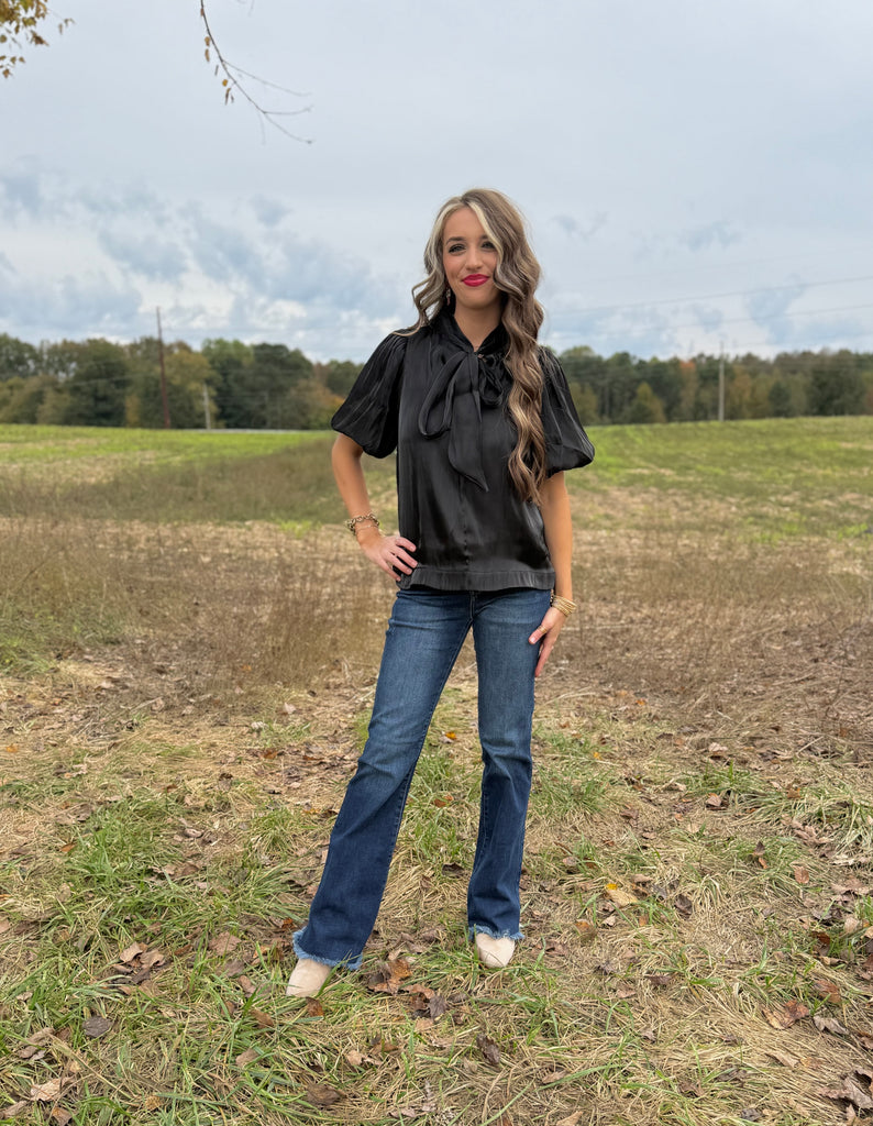 Short puff sleeve sheer top with bow detail and lined. True to size fit. 100% polyester
