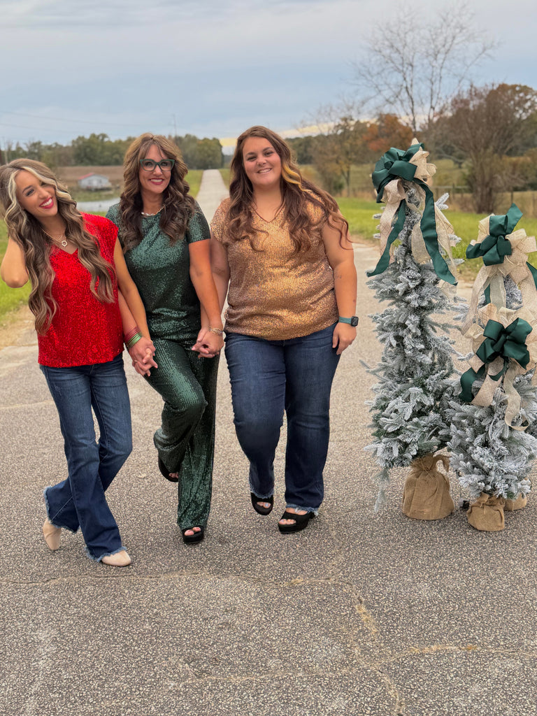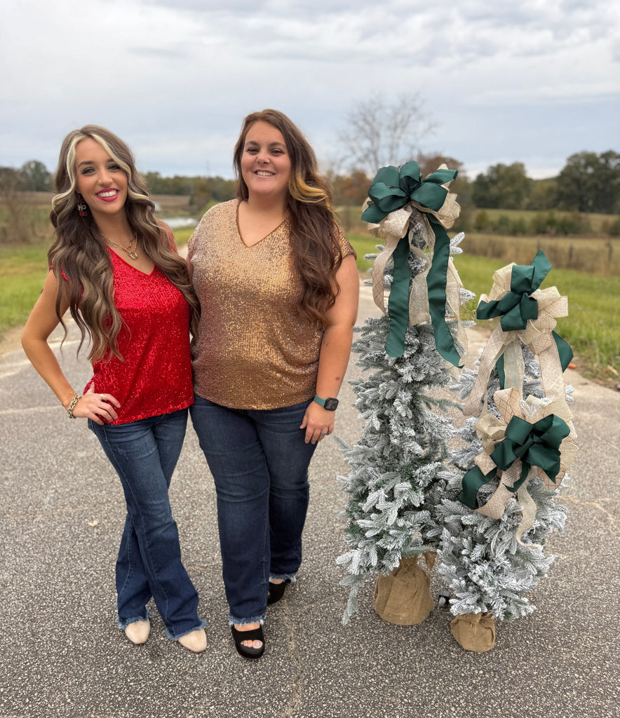 Red v-neck sequin short sleeve top. True to size fit. 95% polyester, 5% spandex
