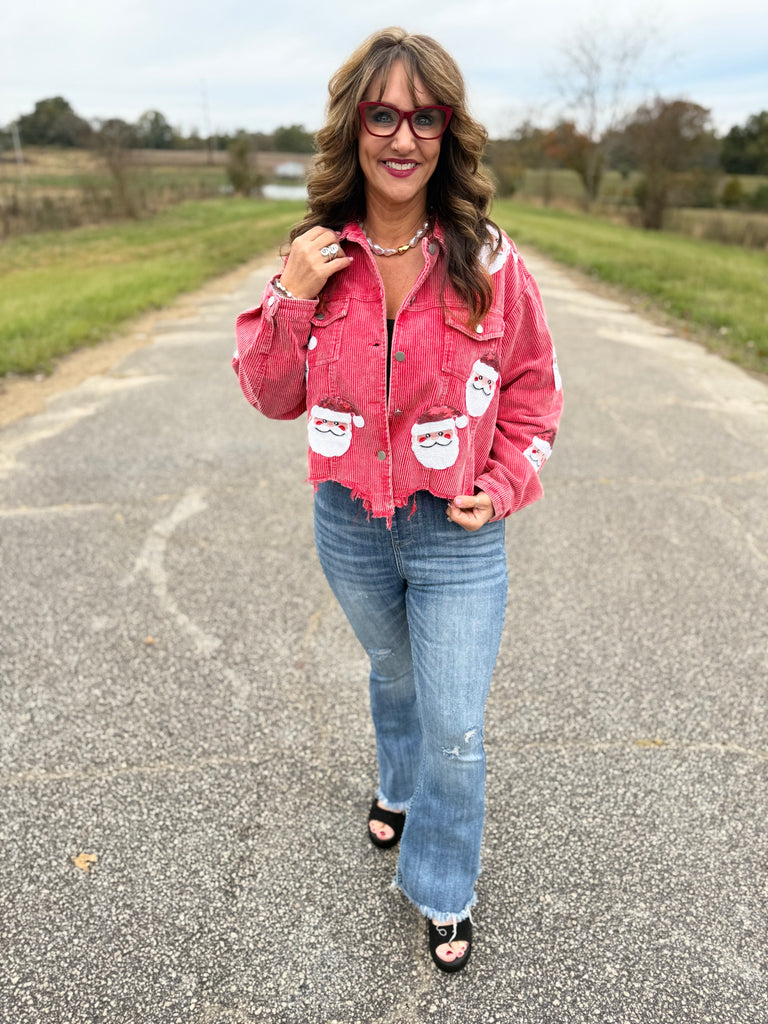 Vintage washed red corduroy jacket with Santa sequin patch detail. Model is wearing a size medium. 100% cotton