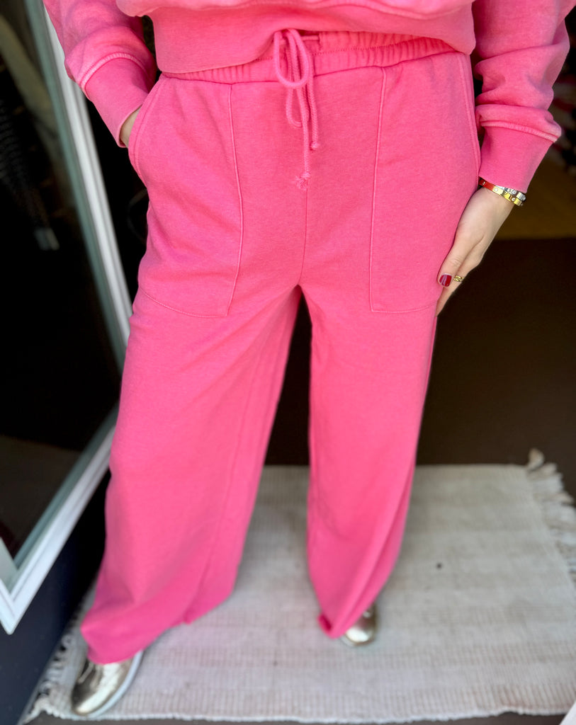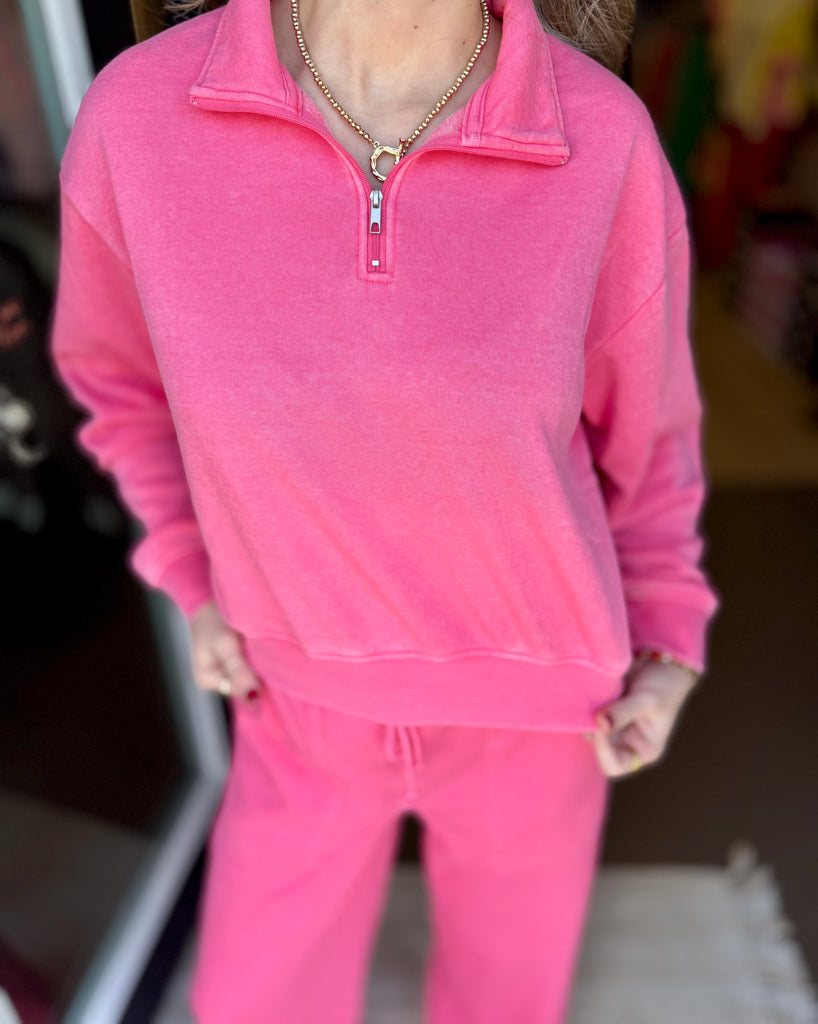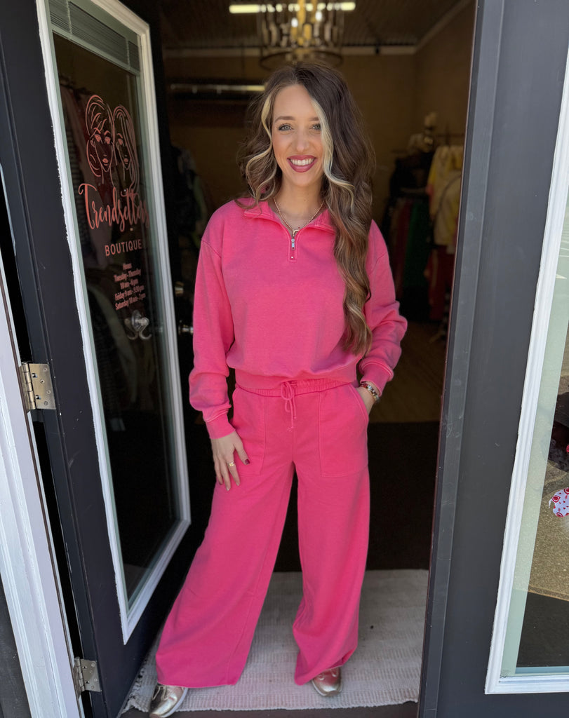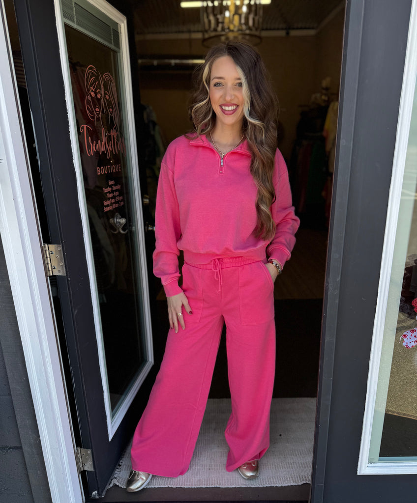 Super soft two piece pink matching set. Functional zipper, pockets, and drawstring. SO comfy and one of our best sellers. Model is wearing her true size small. 51% cotton, 49% polyester