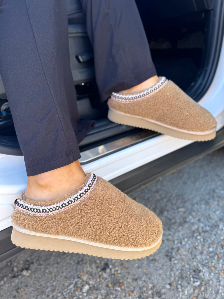 Corkys Footwear. Tan shearling fuzzy slippers. Bottom rubber sole perfect for inside and outside wear. Inside fur lining perfect for all the cozy vibes. True to size fit, if half size we recommend sizing up.