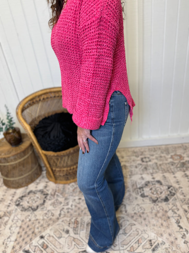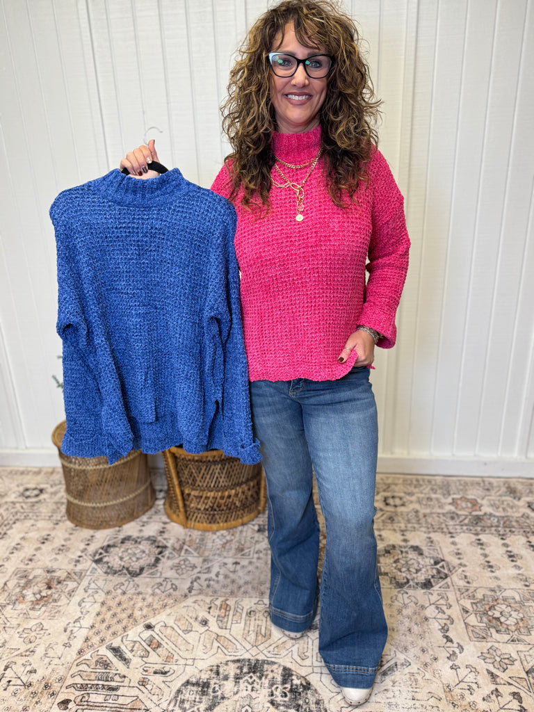 High neck knit sweater with flowy sleeves. Model is wearing a size medium. 100% polyester