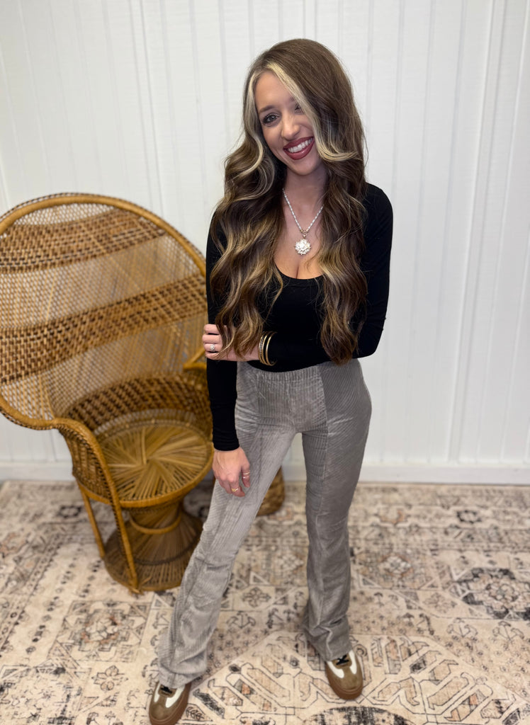 Velvet ribbed flare leggings in the color stone grey. Model is wearing a size small. 95% polyester, 5% spandex