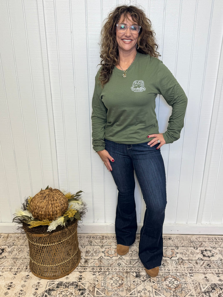 Hunter green long sleeve tee with Trendsetters front corner and back logo. Support your trendy girls with your everyday wear. Gildan soft style tee, 100% cotton.