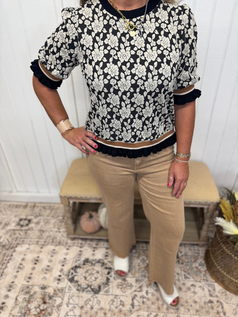 Black textured knit top with contrast banded puff sleeves. True to size fit. Self: 80% polyester, 20% spandex. Contrast: 70% viscose, 30% nylon.